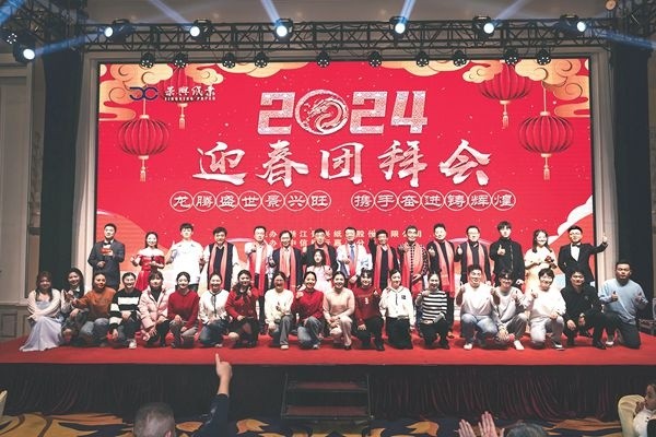 2 月3 日晚,景興紙業2024 年迎春團拜會在平湖圣雷克大酒店隆重舉辦。公司董事長朱在龍、副董事長戈海華、總經理王志明等高層領導、各級管理人員及特邀嘉賓歡聚一堂,攜手共繪2024 年的美好新篇章。