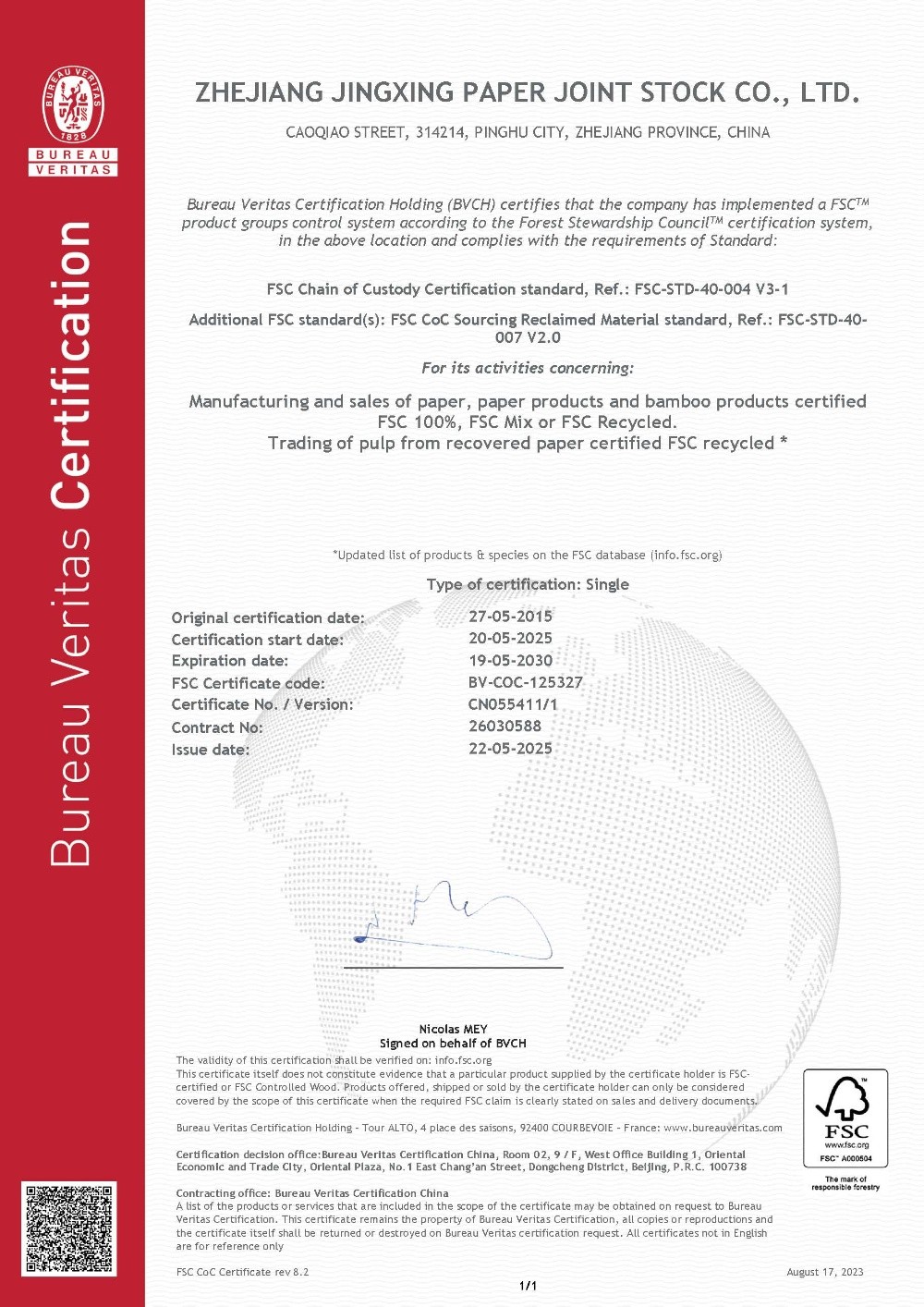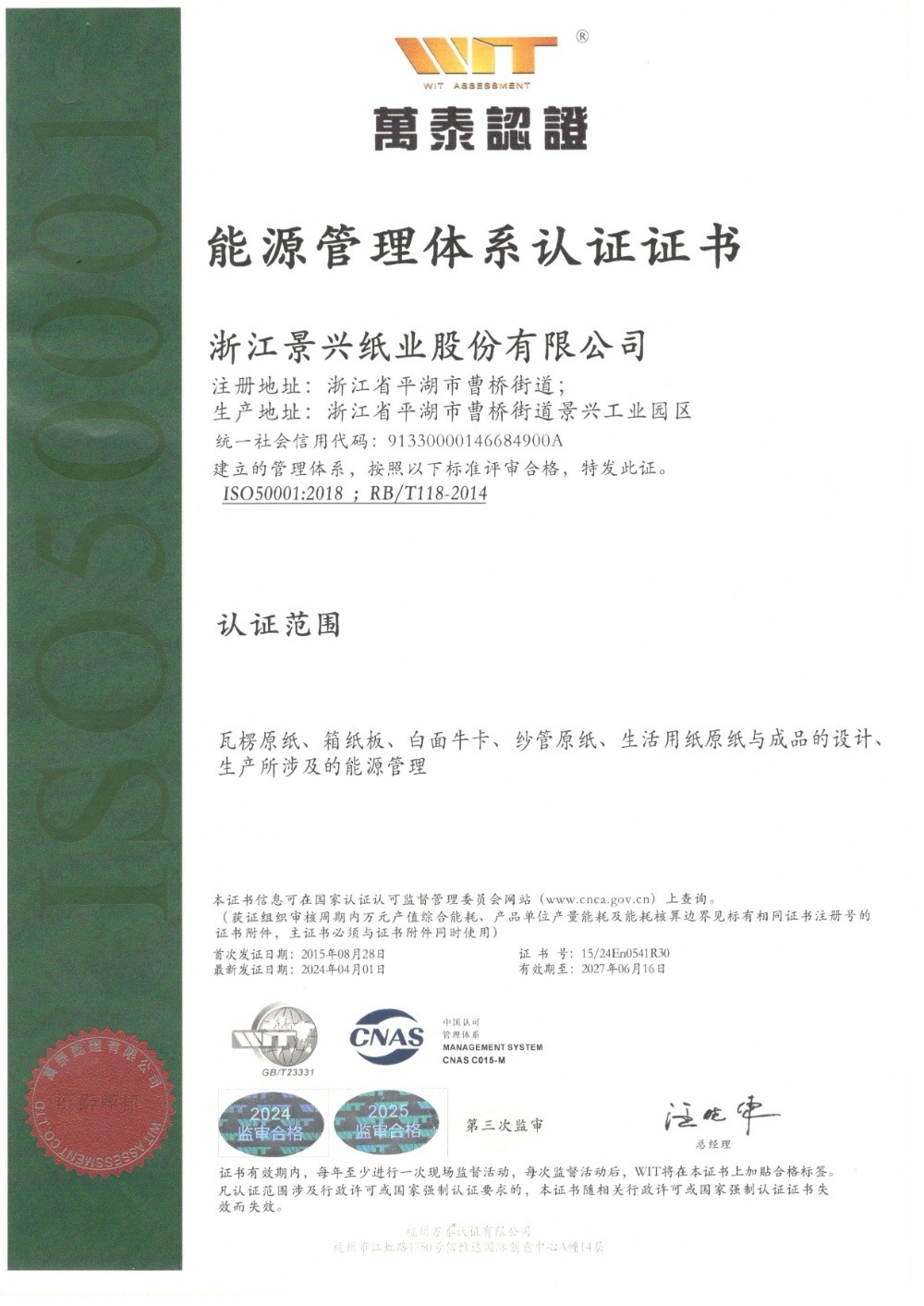 景興紙業(yè)于1996年率先在同行業(yè)通過ISO9001質(zhì)量管理體系認(rèn)證,2002年通過ISO14001環(huán)境管理體系認(rèn)證,2014年通過OHSAS18001職業(yè)健康安全管理體系認(rèn)證,2015年通過GB/T23331能源管理體系和FSC?森林體系認(rèn)證,2018年通過兩化融合管理體系認(rèn)證。